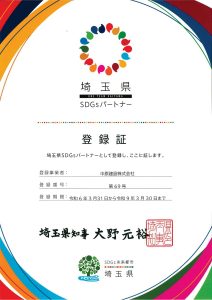 SDGsの取組を自ら実施、公表する県内企業・団体等を「埼玉県SDGsパートナー」として県が登録します。これにより県内企業・団体等が行う活動とSDGsとの関連性を明確にすることで県内企業等におけるSDGs達成に向けた具体的な取組を促進し、企業等の価値向上及び競争力の強化を図るとともに、県が進める「埼玉版SDGs」を共に推進することを目的としています。下記リンクにて、弊社のSDGs達成に向けた取り組みを紹介しております。